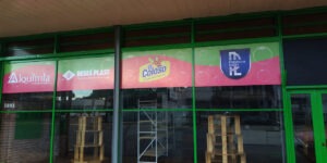 Diseño de cartelería y vidriera para un local de distribución de productos de limpieza y afines realizados en el año 2021.